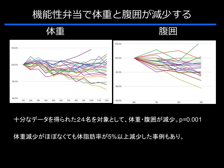 - 十分なデータを得られた24名の統計学的解析の結果は、ヘルスデバイスの活用と機能性弁当の摂取によって、体重、腹囲の減少が見られました。 体重の減少がほぼなくても体脂肪率が5%以上減少した人もいました。